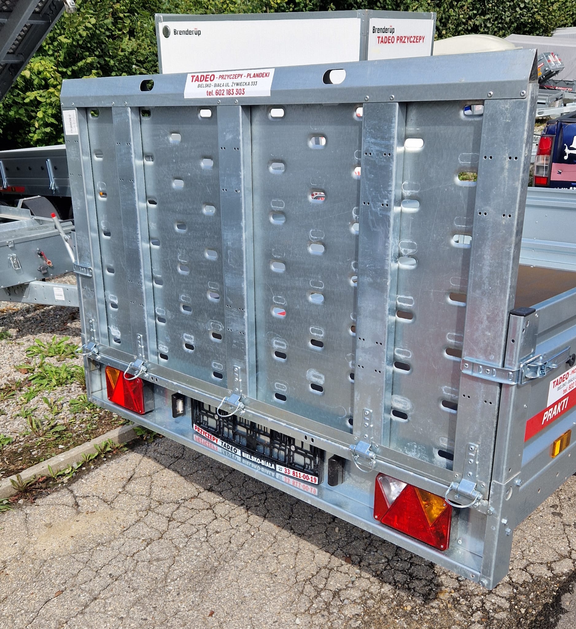 Solidna niehamowana przyczepa bagażowa dla profesjonalistów z uchylnym dyszlem ułatwiającym rozładunek np. sypkiego towaru. Wysokie burty (400 mm) z blachy stalowej ocynkowanej z możliwością otwierania przedniej oraz tylnej burty. Rama nośna wykonana z profili giętych z blachy stalowej ocynkowanej skręcana śrubami. Podłoga wykonana ze sklejki wodoodpornej antypoślizgowej. Pustą przyczepę można przechowywać postawioną na tylnej burcie oszczędzając miejsce w garażu.